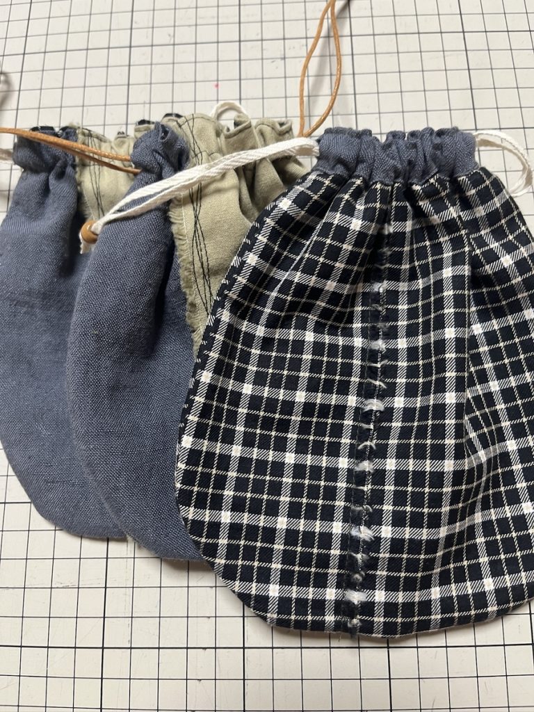巾着(きんちゃく)。布や革などの素材で作った小さな袋。口をひもで締める。