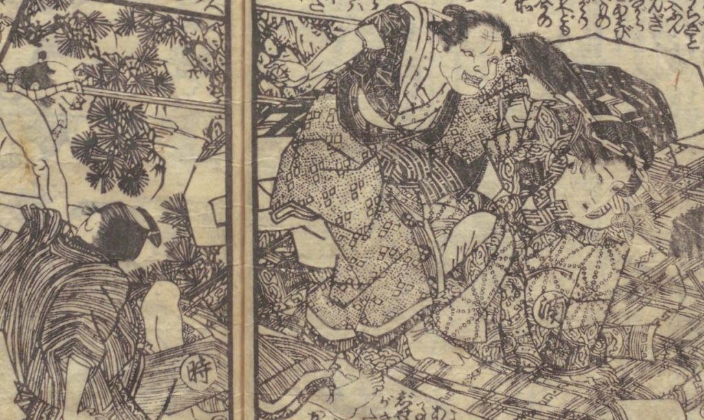 中央の遣手が、遊女と恋仲になった男との密会に現れて、二人を引き離す場面。